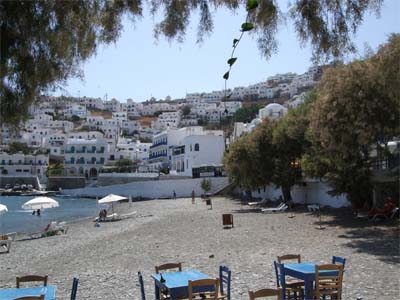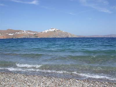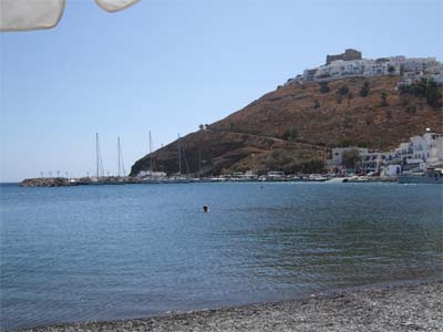 With a great view of the Chora and kastro above, the pebbly beach makes for a very pleasant way to spend a day.