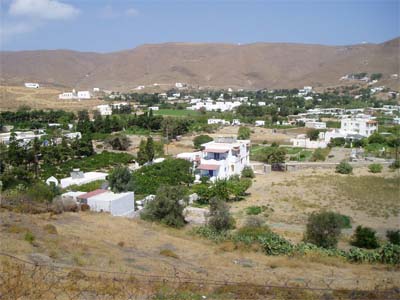 You can see Chora in the far distance and there is a red-roofed church just behind the road.