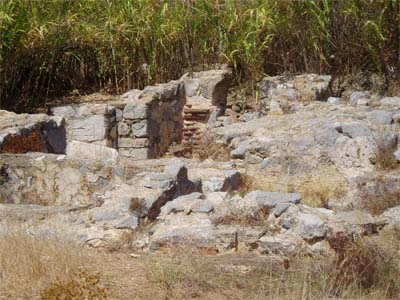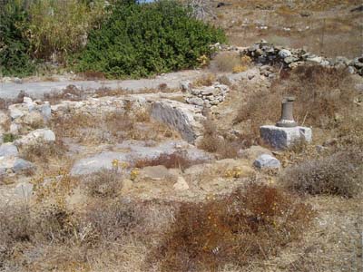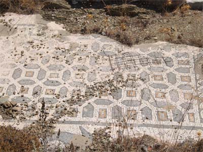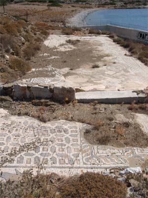 The baths are at the end of a dirt path, but the mosaics were covered with a protective layer of chippings to protect them from the elements. There are some photographs in the museums and some pictures on-line on some of the other Astypalean websites. The design of the mosaic is that of the zodiac with a rather androgenous characterisation of time at the centre.