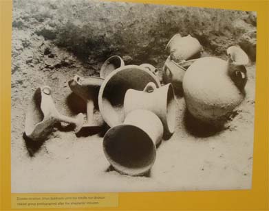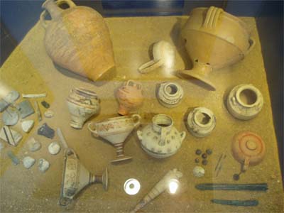 From Mycenean chamber tombs at Armenochori (found by local shepherds in the soft rock as shown in the central picture) there are fabulous tools, weapons, obsidian blades and a wonderful assortment of vases with delicate designs and patterns, spindle-whorls, amphorae, jars and assorted vessels and funery urns. There's also a display of late 4th-century silver coins – tetradrachms of Ephesus and various designs with the faces of deer and bees.