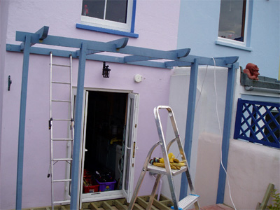Having constructed the pergola (based on a Greek design that I'd seen on holiday) I numbered each part for easy reassembly and gave them three coats of exterior wood paint.