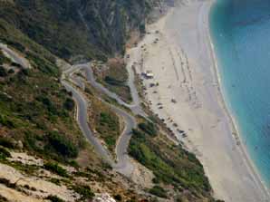 On the west coast about 10 kilometres west of Agia Efimía, and the same south of Assos, these views were taken from the viewpoint on the Assos side. Myrtos is one of the most photographed beaches.